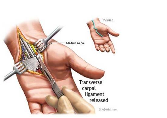 • 손목 터널 해제술: 증상이 심하거나 비수술적 치료로도 호전되지 않는 경우 손목터널 해제 수술을 권할 수 있습니다. 이 시술은 정중 신경의 압박을 완화하기 위해 손목 터널의 지붕을 형성하는 인대를 절단하는 것을 포함합니다.